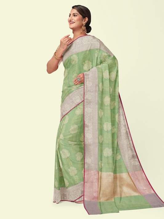 Faishana Presents Handwoven Pistachio Matka Silk Tilfi Boota Zari Border With Mehndi Green Blouse Banarasi Saree
