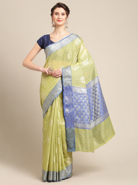 Faishana Presents Handwoven Pistachio Matka Silk Boota Skirt Border With Blue Blouse Banarasi Saree