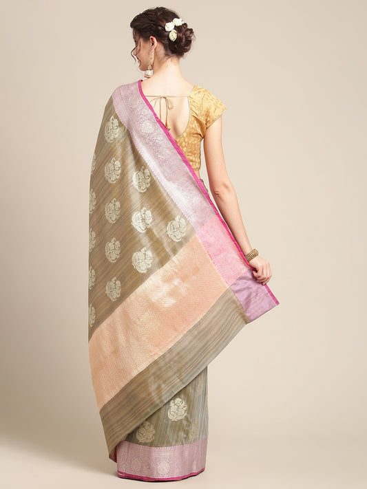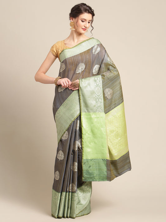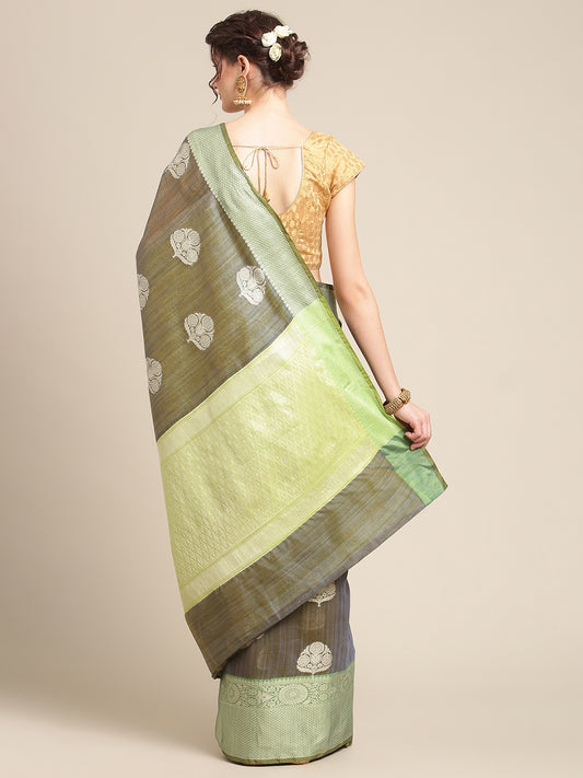 Faishana Presents Handwoven Grey Matka Silk Boota Zari Border With Parrot Green Blouse Banarasi Saree