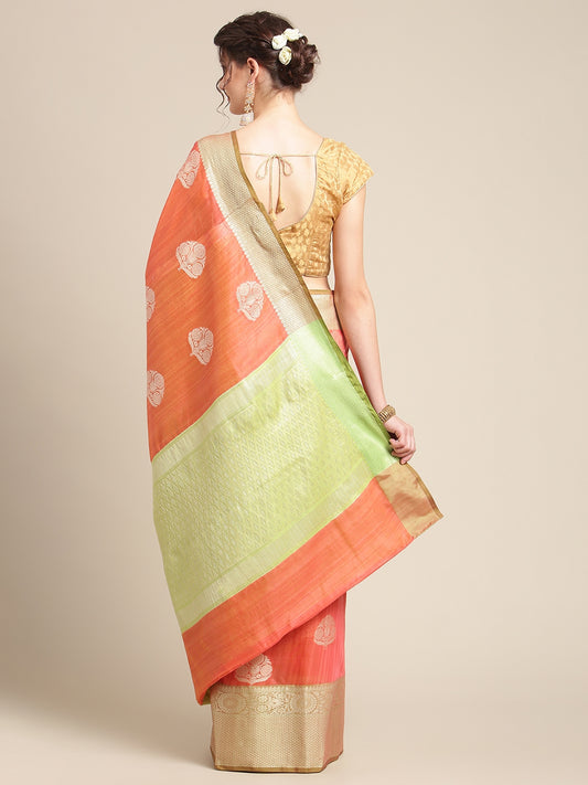 Faishana Presents Handwoven Orange Matka Silk Boota Zari Border With Parrot Green Blouse Banarasi Saree
