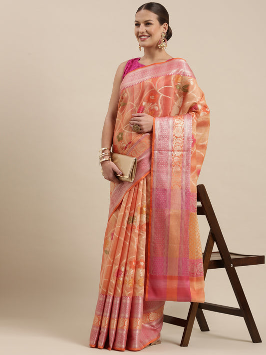 Faishana Presents Handwoven Peach Matka Silk Alfi Jaal Skirt Border With Orange Blouse Banarasi Saree