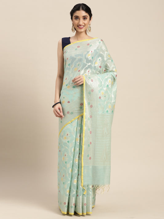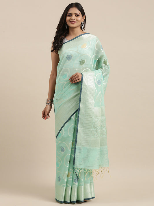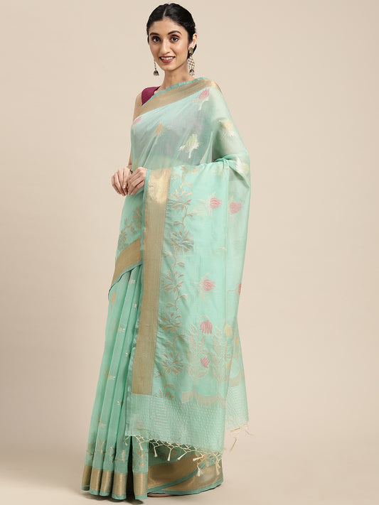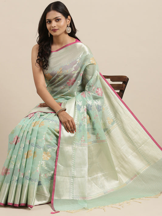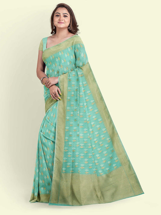 Faishana Presents Sea Green Kora Cotton Alfi Booti With Sea Green Blouse Banarasi Saree