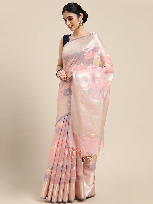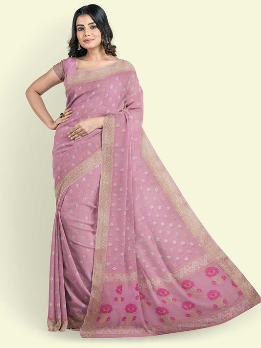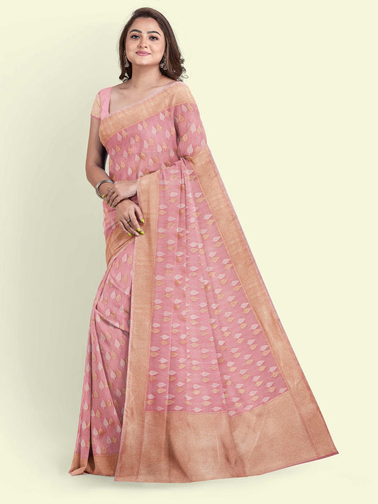 Faishana Presents Pink Kora Cotton Alfi Booti With Pink Blouse Banarasi Saree