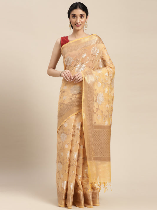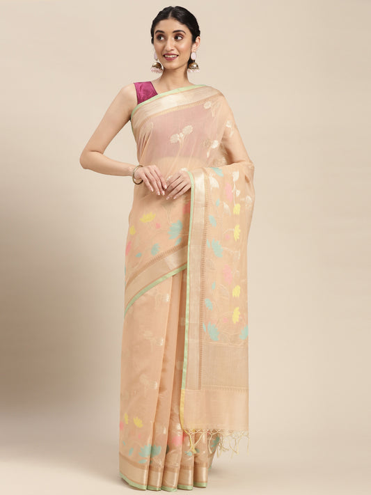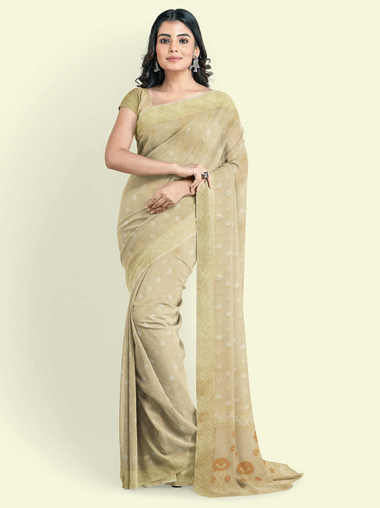 Faishana Presents Beige Kora Cotton Alfi Booti With Beige Blouse Banarasi Saree