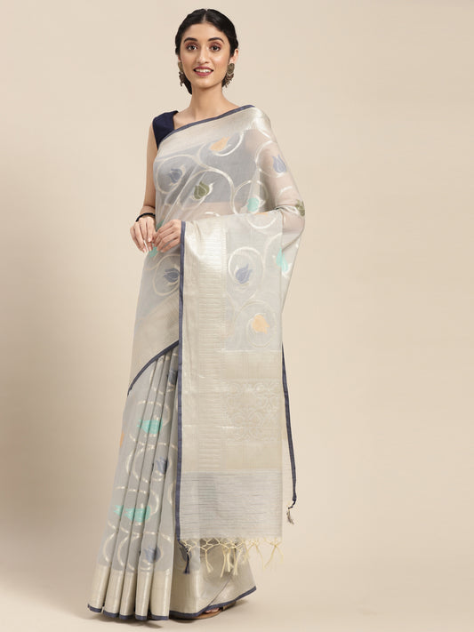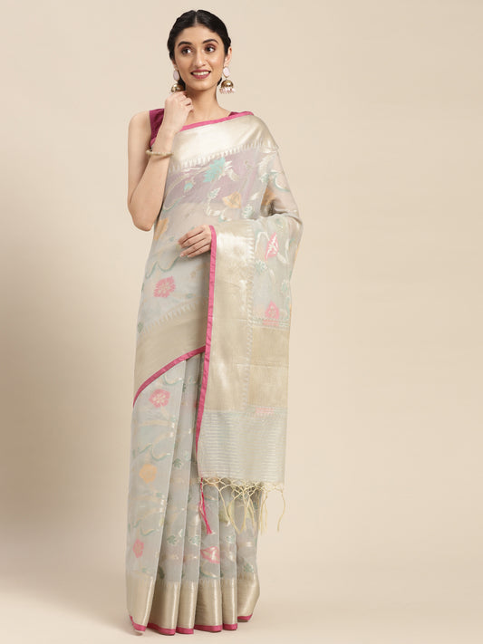 Faishana Presents Handwoven Grey Masrise Cotton Tilfi Jaal Zari Border With Grey Blouse Banarasi Saree