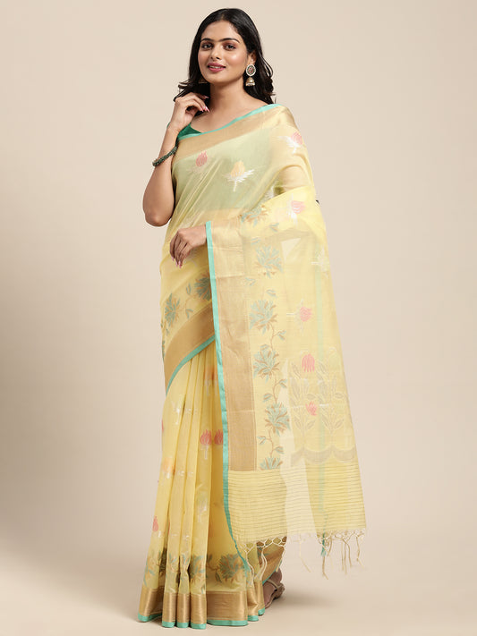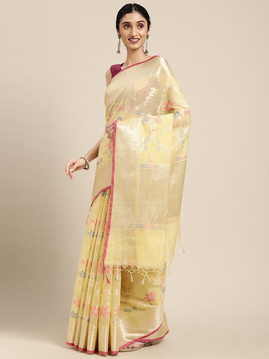 Faishana Presents Handwoven Yellow Masrise Cotton Tilfi Jaal Zari Border With Yellow Blouse Banarasi Saree