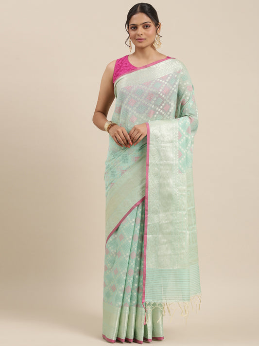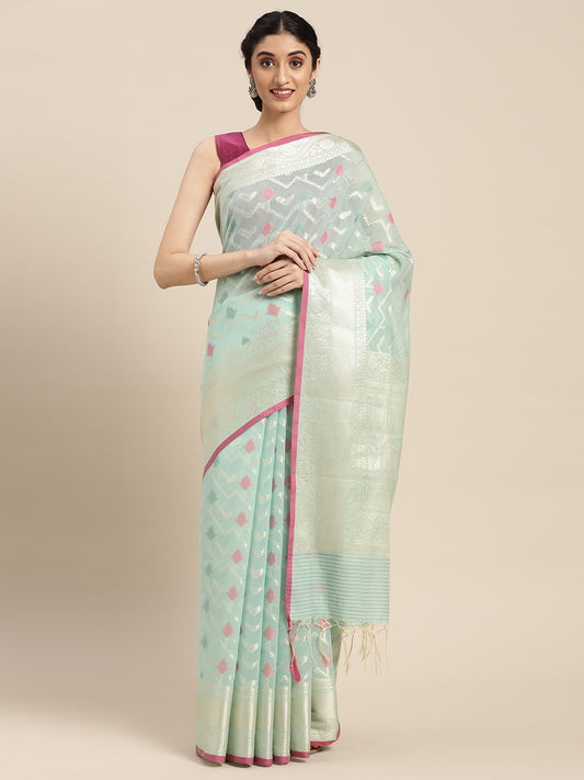 Faishana Presents Handwoven Seagreen Masrise Cotton Zig-Zag Jaal Zari Border With Seagreen Blouse Banarasi Saree