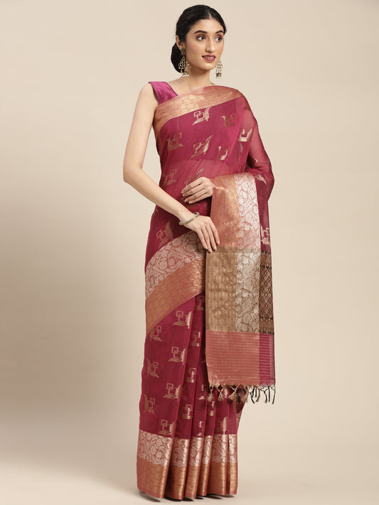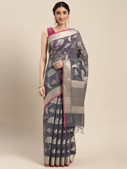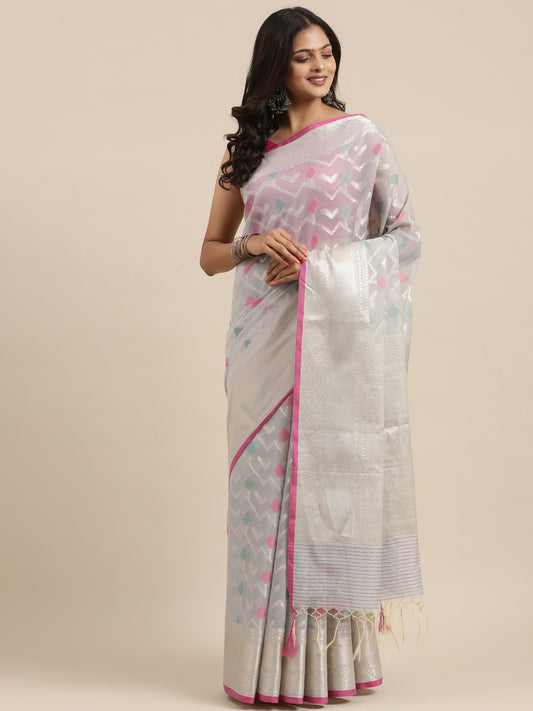 Faishana Presents Handwoven Grey Masrise Cotton Tilfi Jaal Zari Border With Magenta Blouse Banarasi Saree