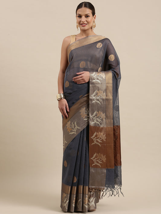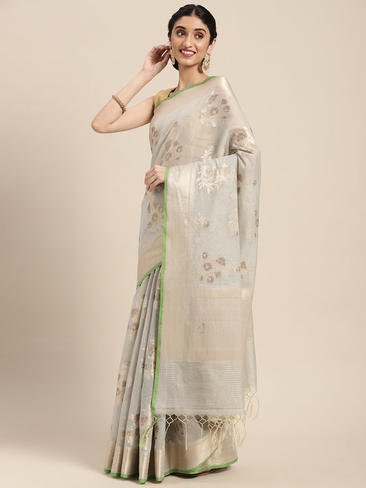 Faishana Presents Handwoven Grey Masrise Cotton Alfi Boota Zari Border With Grey Blouse Banarasi Saree
