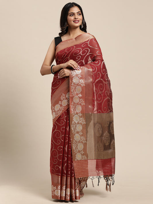 Faishana Presents Handwoven Red Masrise Cotton Jaal Alfi Skirt Border With Cheeku Color Blouse Banarasi Saree