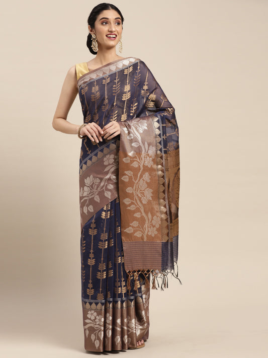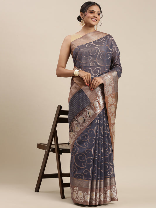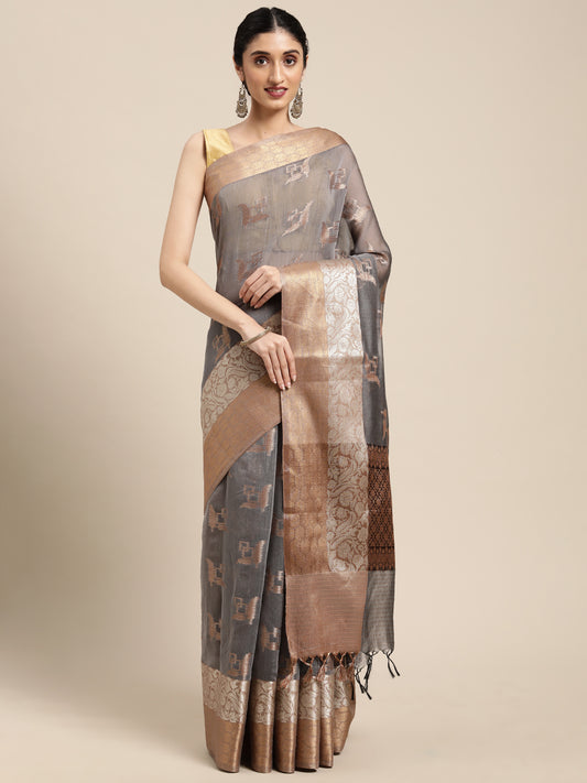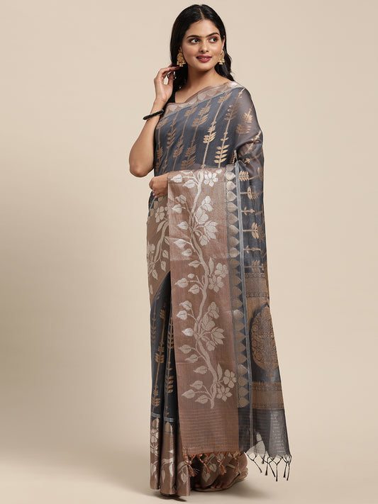 Faishana Presents Handwoven Grey Masrise Cotton Alfi Skirt Border With Brown Blouse Banarasi Saree