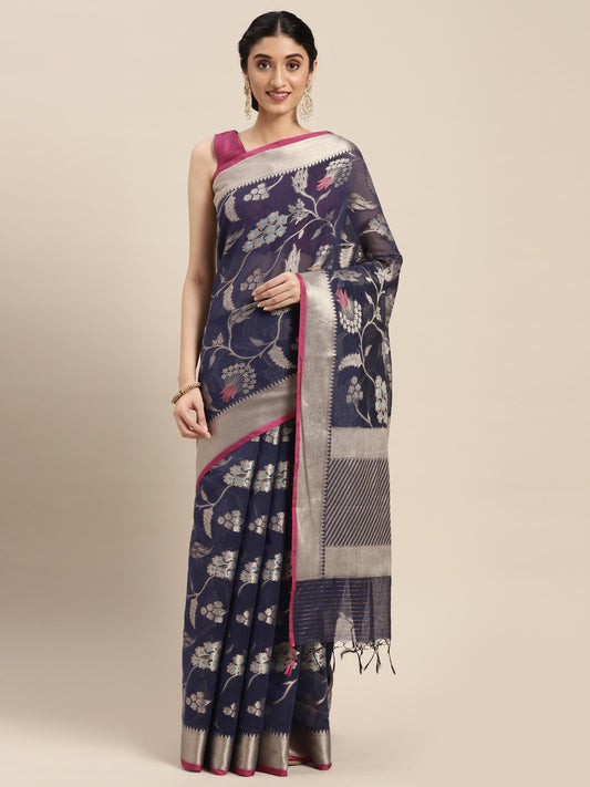 Faishana Presents Handwoven Blue Masrise Cotton Tilfi Jaal Zari Border With Saree With Magenta Blouse Banarasi Saree