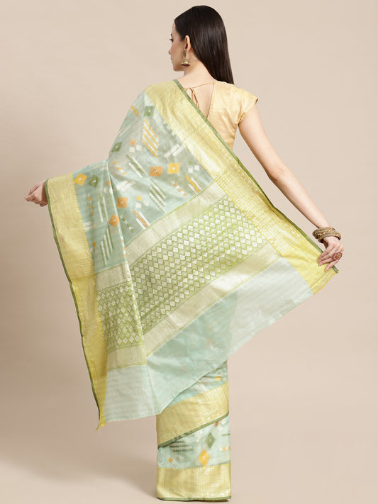Faishana Presents Handwoven Seagreen Mulberry Silk Geometrical Motif Tilfi Zari Border With Parrot Green Blouse Banarasi Saree