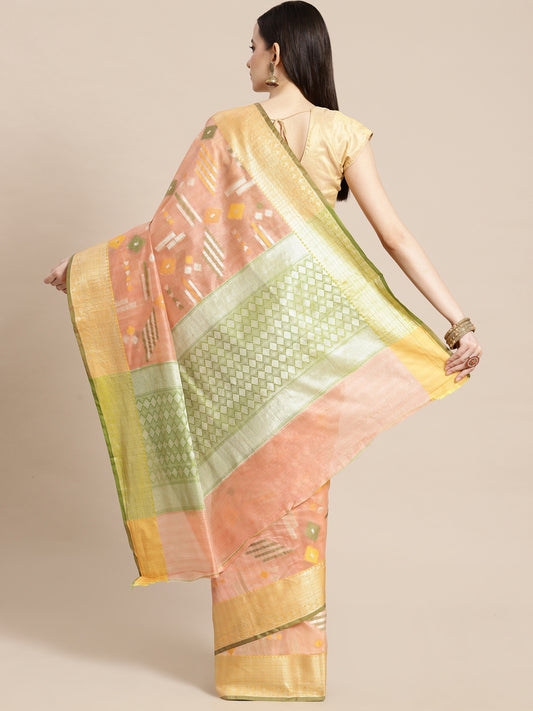 Faishana Presents Handwoven Peach Mulberry Silk Geometrical Motif Tilfi Zari Border With Parrot Green Blouse Banarasi Saree
