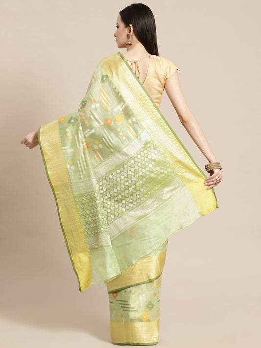 Faishana Presents Handwoven Pistachio Green Mulberry Silk Geometrical Motif Tilfi Zari Border With Parrot Green Blouse Banarasi Saree