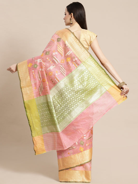 Faishana Presents Handwoven Pink Mulberry Silk Geometrical Motif Tilfi Zari Border With Parrot Green Blouse Banarasi Saree