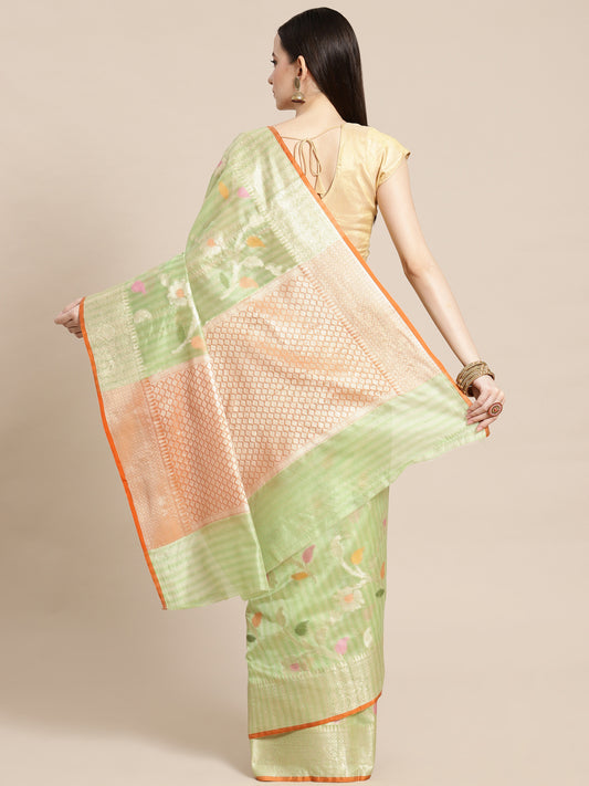 Faishana Presents Handwoven Pistachio Green Mulberry Silk Tilfi Jaal Zari Border With Orange Blouse Banarasi Saree