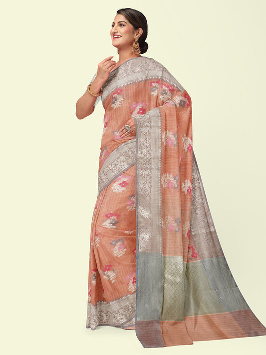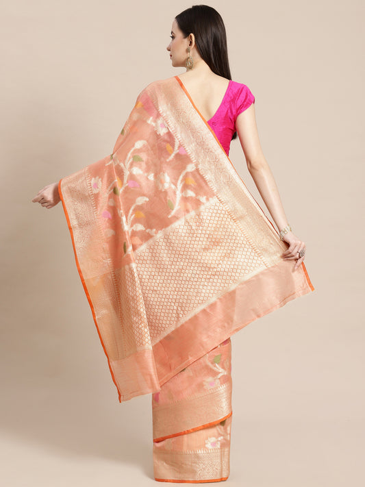 Faishana Presents Handwoven Peach Mulberry Silk Floral Booti With White Blouse Banarasi Saree