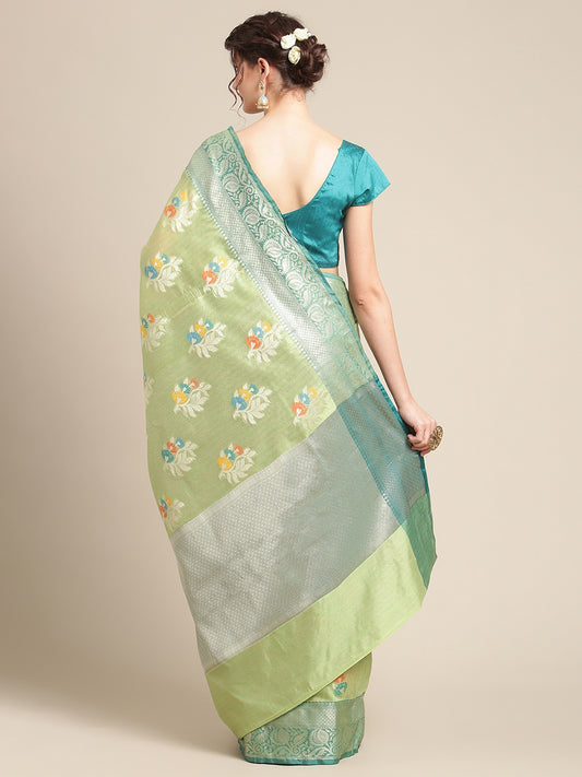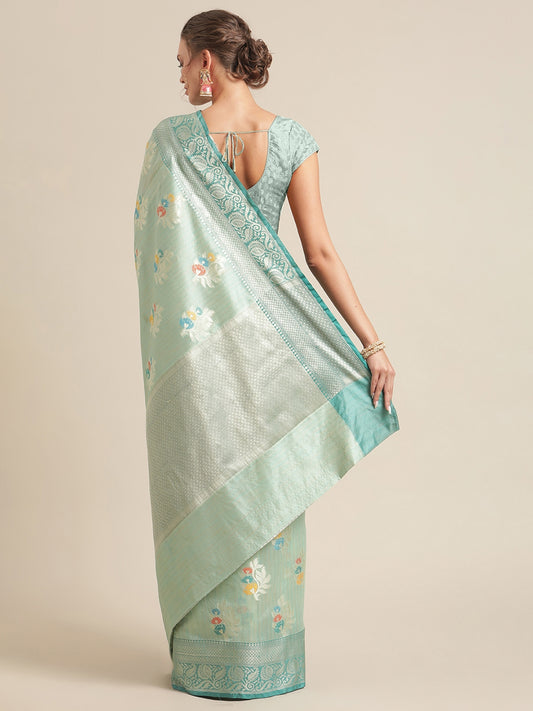 Faishana Presents Handwoven Seagreen Mulberry Silk Tilfi Boota Zari Border With Green Blouse Banarasi Saree