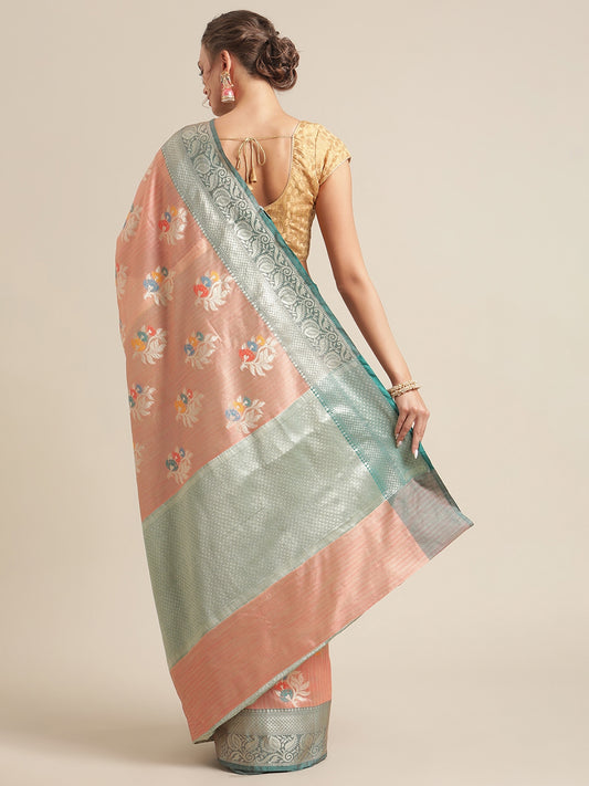 Faishana Presents Handwoven Peach Mulberry Silk Tilfi Boota Zari Border With Green Blouse Banarasi Saree