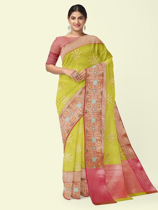 Green Cotton Blend Banarasi Sarees For Women GEHKR 106