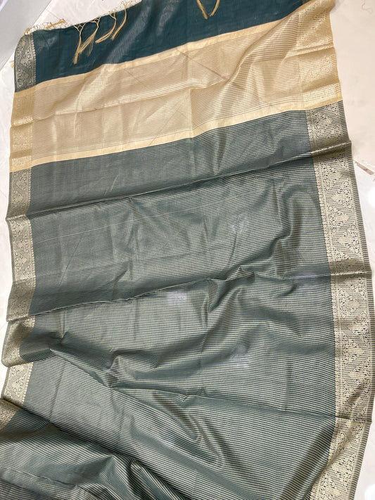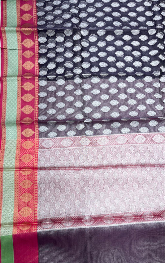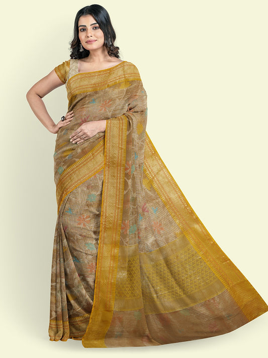 Faishana Presents Grey Woven Organza Beige Border With Beige Blouse Banarasi Saree