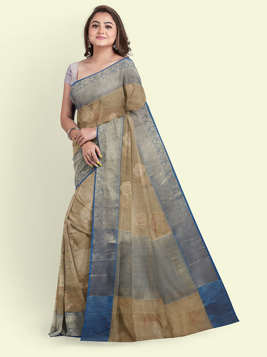 Faishana Presents Brown Organza Silver Zari Floral Booti with Contrast Blue Floral Booti Pallu and Skirt Zari 2D Border with Blue Blouse
