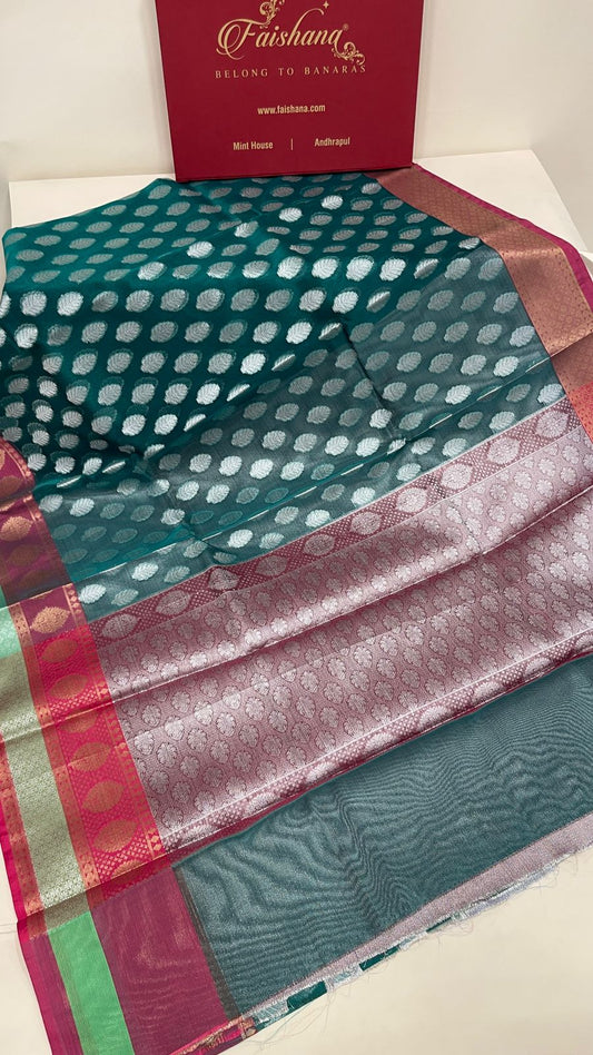 Banarasi organza sarees are exquisite handcrafted pieces that combine the rich tradition of Banaras with the exotic beauty of organza. The lightweight, sheer fabric organza adds a delicate touch to these sarees, making them perfect for special occasions like weddings, festivals, formal functions, etc. Whether adorned with classical motifs or modern geometric patterns, Banarasi organza sarees always exude an aura of grace and sophistication. They are appreciated not only for their aesthetics but also for their cultural significance, as they represent the centuries-old weaving heritage of Benares, a city also known as Varanasi, famous for its silk textiles and handicrafts. Banarasi organza sarees are an exquisite representation of Indian craftsmanship, combining the luxurious texture of organza with the intricate designs characteristic of Banarasi weaving. Known for their lightweight and airy quality, these sarees drape beautifully, making them ideal for both formal and festive occasions. Faishana organza sarees are a chic addition to any wardrobe, offering a perfect blend of tradition and contemporary style, ideal for women looking to make a fashion statement.