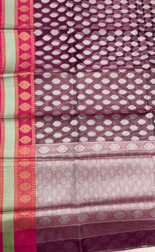 Faishana Presents Purple Organza Silver Zari Floral Booti with Purple Floral Booti Pallu and Skirt Zari 2D Border with Purple Blouse