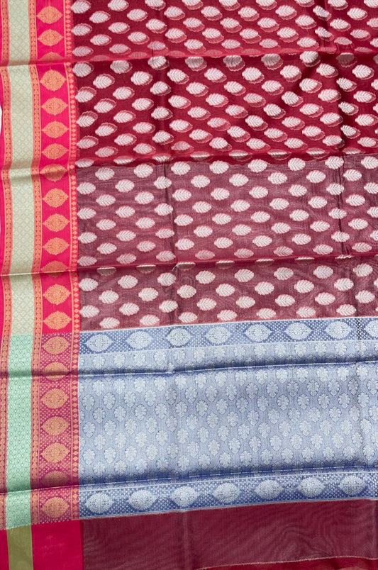 Faishana Presents Handwoven Green Cotton Blend Zari Booti With Maroon Blouse Faishana PresentsSaree