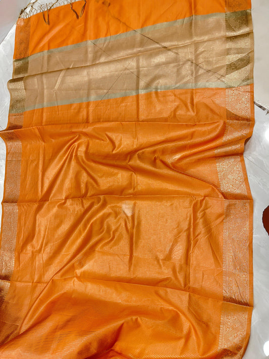 Faishana Presents Orange Organza Zari Plain Striped with Beige Zari Border with Contrast Beige Pallu and Orange Blouse