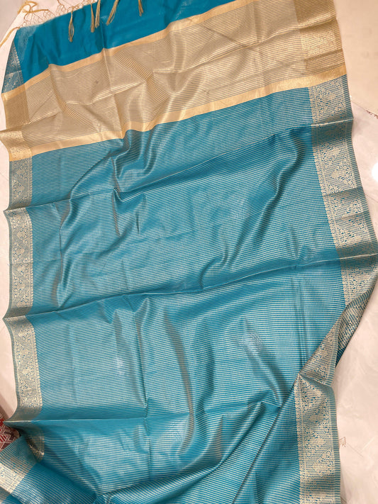Faishana Presents Sky Blue Organza Zari Plain Striped with Gold Zari Border with Contrast Gold Pallu and Sky Blue Blouse