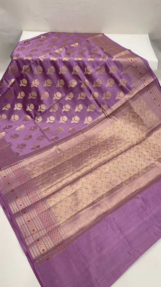 Regal Creation: Faishana Pure Silk Handloom Mauve Chiniya Silk Saree with Gold Zari Floral Booti and Minakari Zari Border with a Stunning Mauve Blouse Piece
