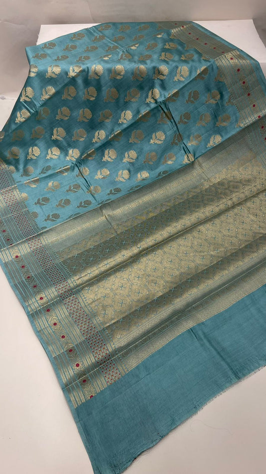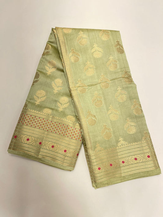 Elegant Faishana Pure Silk Handloom Light Green Chiniya Silk with Gold Zari Floral Booti and Minakari Border & Light green Blouse Piece