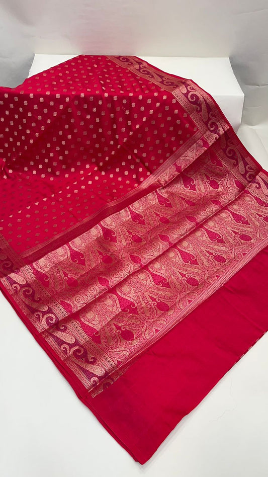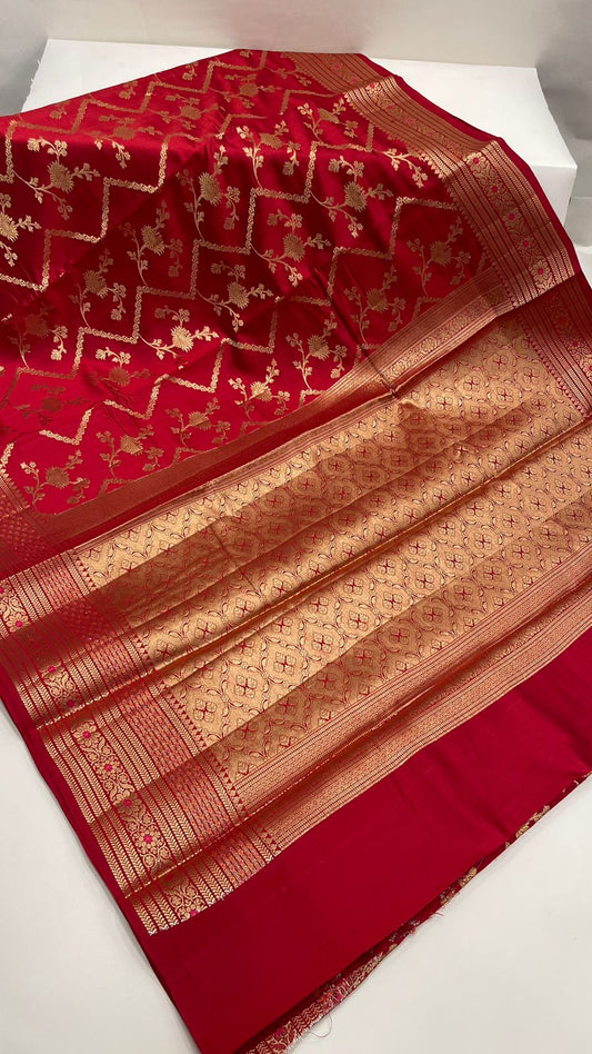 Ravishing Elegance: Faishana's Pure Silk Handloom Red Pure Chiniya Silk Tilfi Zari Jaal Zig-Zag with Minakari Zari Border & Red Blouse Piece