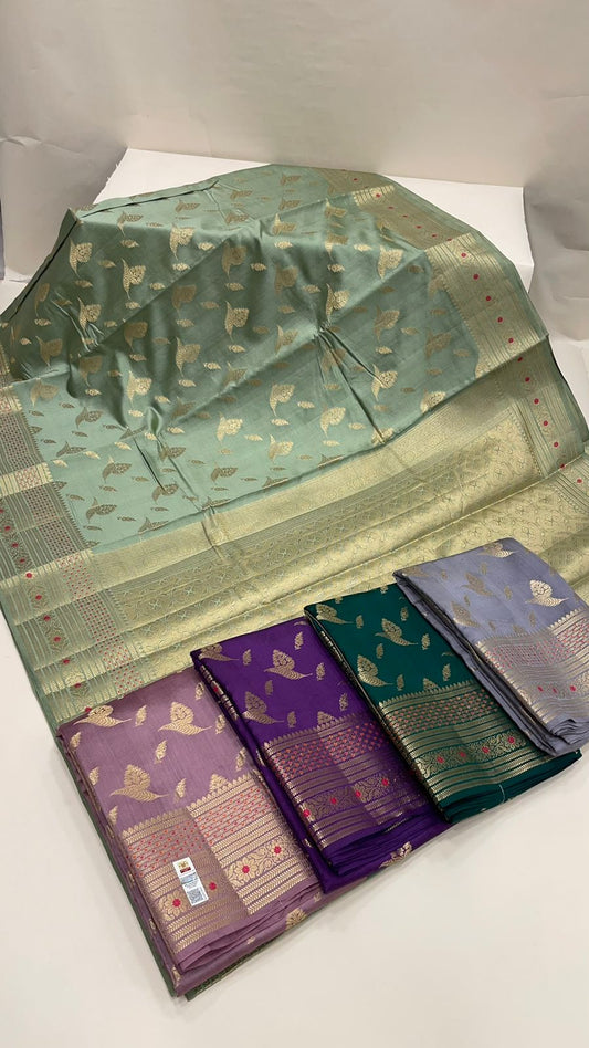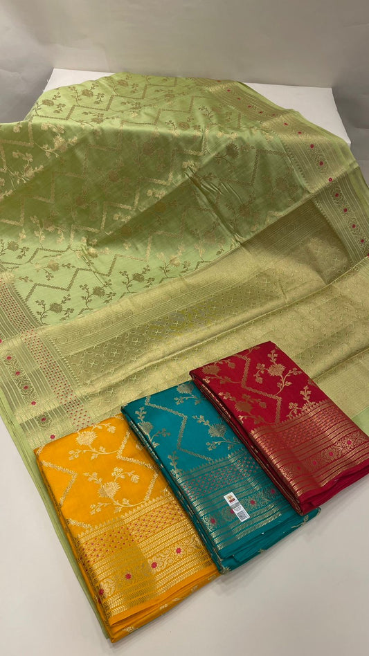 Faishana Presents: Exquisite Pure Silk Handloom Pistachio Chiniya Silk Tilfi Zari Jaal Zig-Zag Banarasi Saree with Minakari Zari Border & Matching Blouse Piece