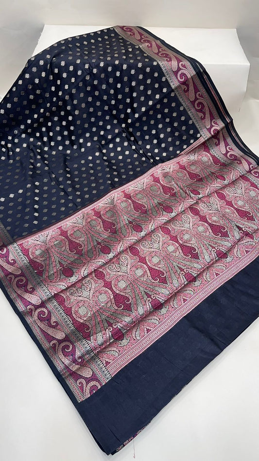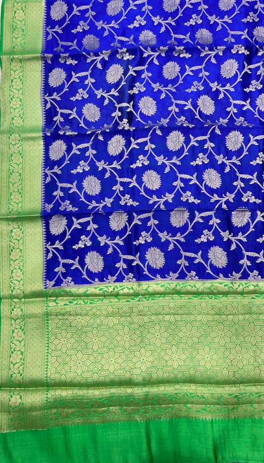 Faishana Pure Handloom Royal Blue Chiniya Silk Floral Silver Zari Tilfi Jaal with Contrast Green Zari Border and Green Blouse