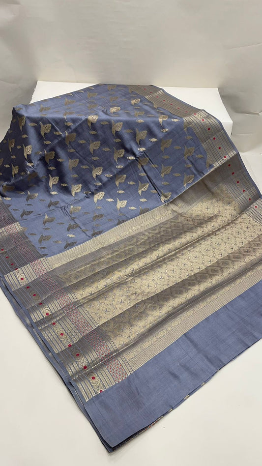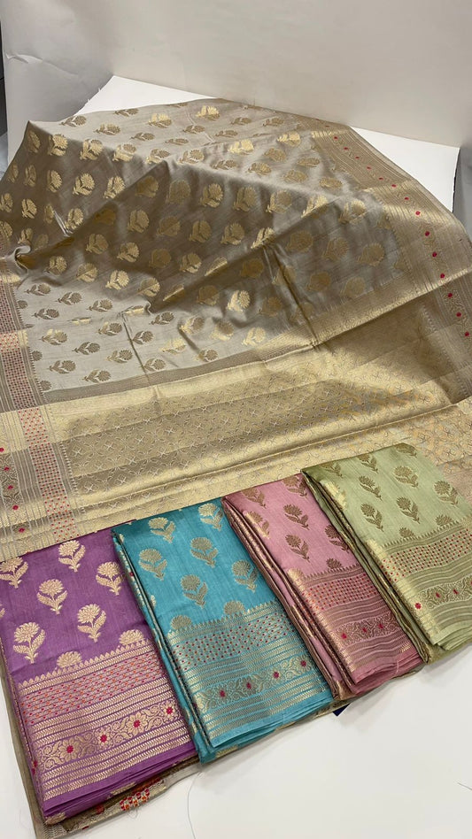 Exquisite Elegance: Faishana Pure Silk Handloom Grey Chiniya Silk Gold Floral Zari Booti with Minakari Border & Grey Blouse