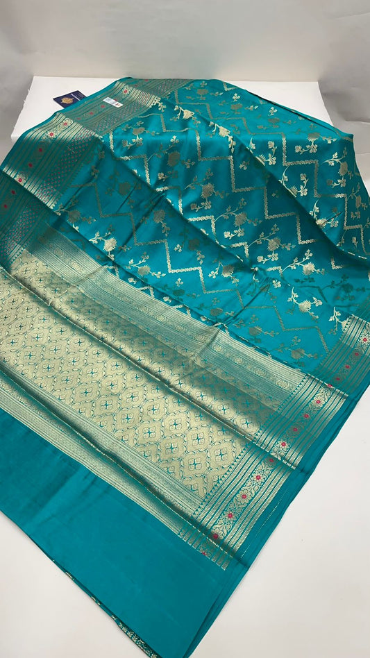 Seamless Elegance: Faishana's Exquisite Seagreen Chiniya Silk Gold Floral Zari Booti and Minakari Zari Border Saree