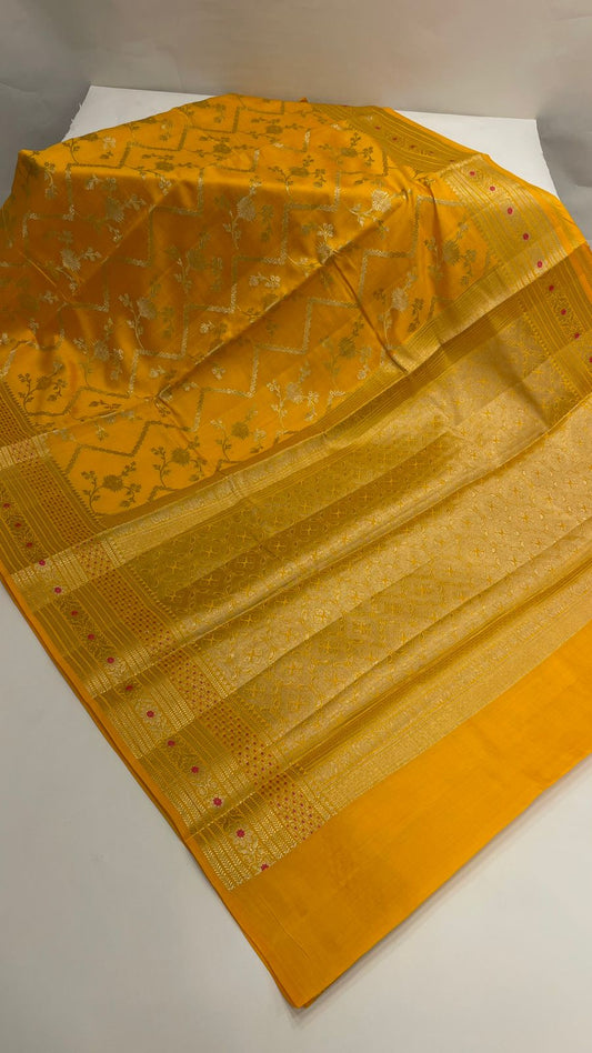 Golden Elegance: Faishana's Exquisite Pure Silk Handloom Gold Chiniya Silk Zari Tilfi Jaal Zig-Zag Saree with Minakari Zari Border and Gold Blouse