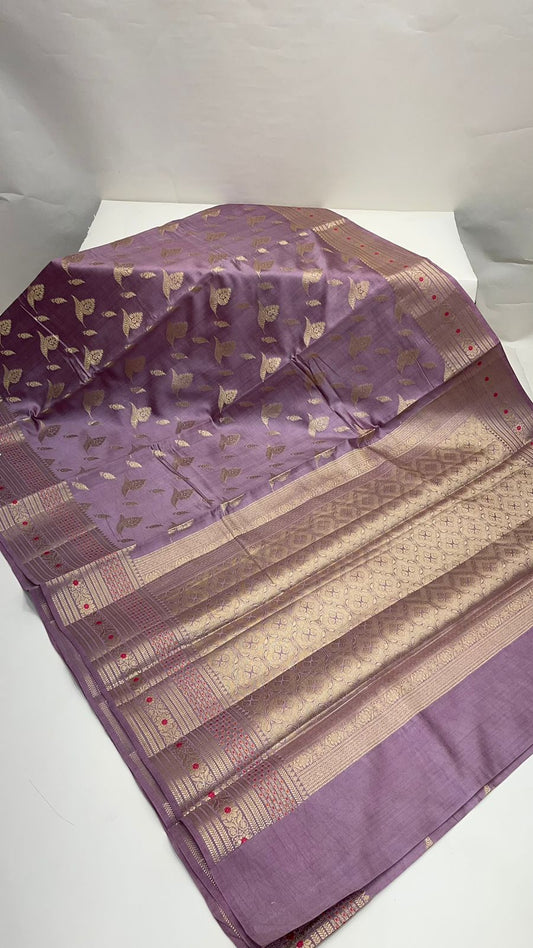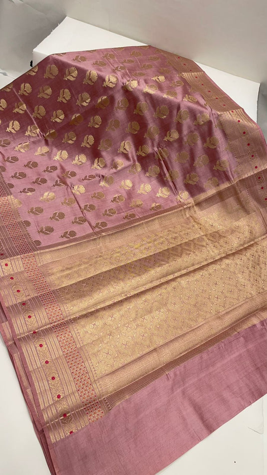 Regal Elegance: Faishana's Pure Silk Handloom Muave Chiniya Silk Gold Floral Zari Booti with Minakari Zari Border Saree and Mauve Blouse