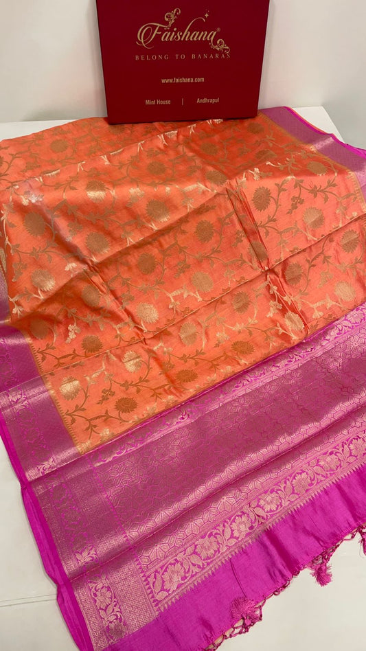 Faishana Pure Handloom Orange Chiniya Silk Floral Silver Zari Tilfi Jaal with Contrast Magenta Zari Border and Magenta Blouse