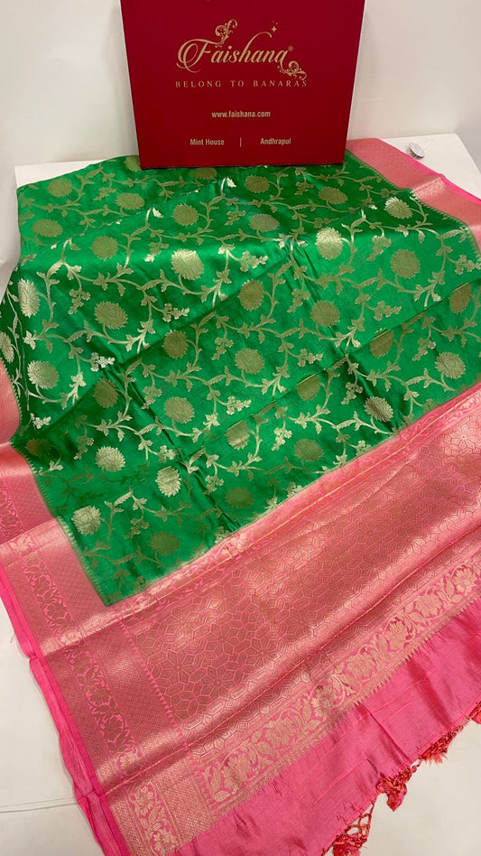 Faishana Pure Handloom Green Chiniya Silk Golden Floral Zari Booti Contrast Pink Skirt Silver Mina Zari Border Golden and Floral Boota Pallu with Pink Blouse