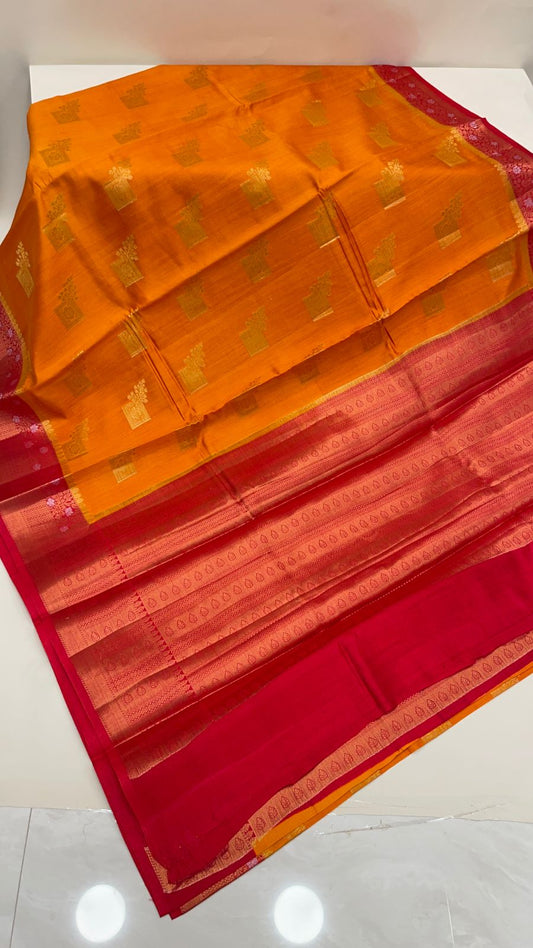 Faishana Pure Handloom Orange Chiniya Silk Golden Floral Zari Boota Contrast Red Skirt Zari Silver Mina Border and Red Blouse