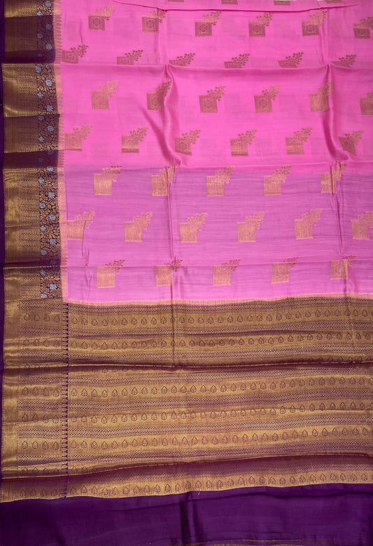 Faishana Pure Handloom Baby Pink Chiniya Silk Golden Floral Zari Boota Contrast Purple Skirt Zari Silver Mina Border and Purple Blouse
