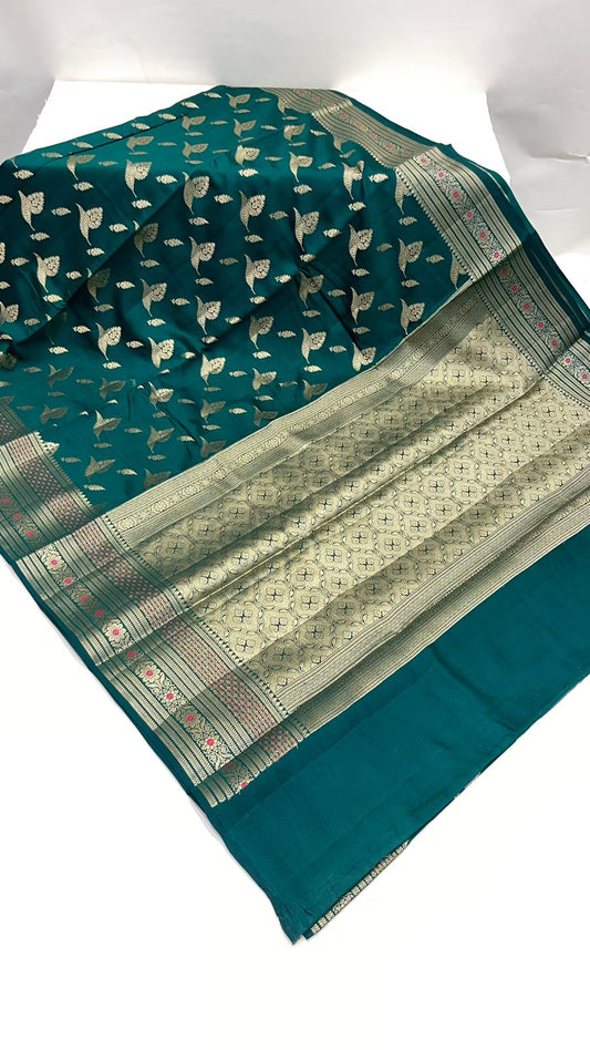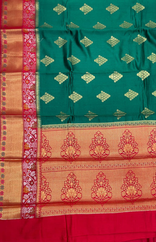 Enchanting Elegance: Faishana Pure Silk Handloom Dark Green Chiniya Silk Gold Floral Zari Booti with Minakari Border & Dark Green Blouse