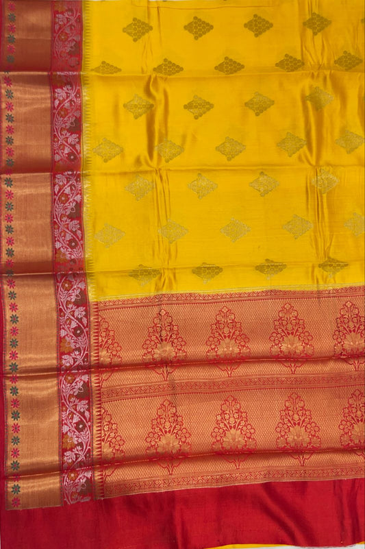Faishana Pure Handloom Yellow Chiniya Silk Golden Floral Zari Booti Contrast Maroon Skirt Silver Mina Zari Dual Border and Maroon Floral Boota Pallu with Maroon Blouse