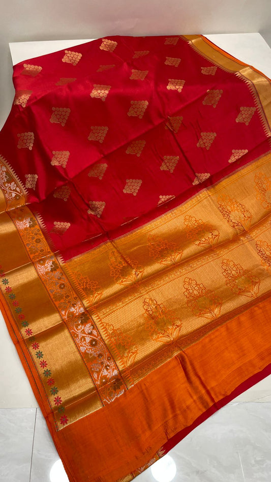 Faishana Pure Handloom Red Chiniya Silk Golden Floral Zari Booti Contrast Orange Skirt Silver Mina Zari Dual Border and Orange Floral Boota Pallu with Orange Blouse