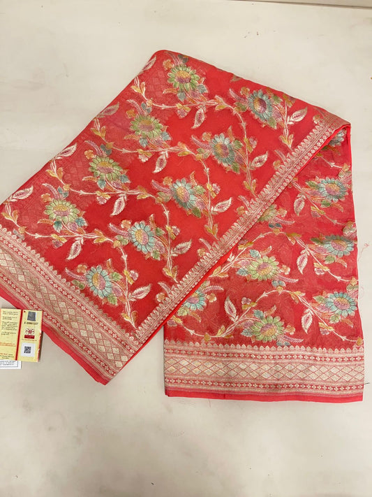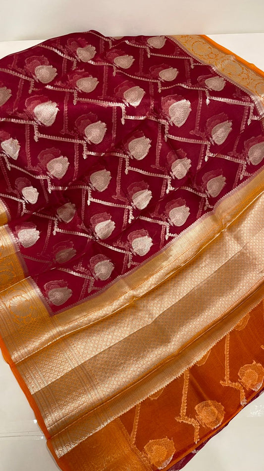 Faishana Pure Handloom Orange Khaddi Georgette Floral Hand painted Zari Jaal with Banarasi Zari Border and Orange Blouse