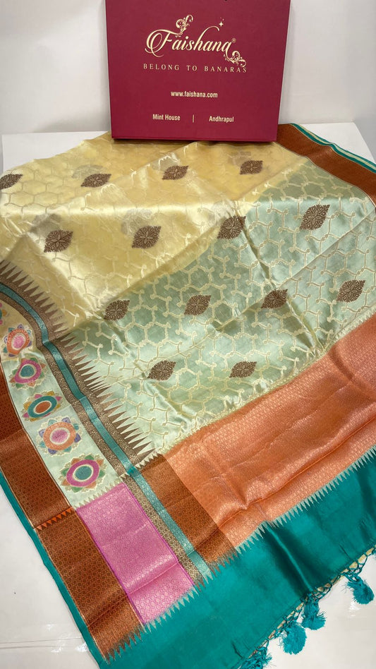 Faishana Pure Handloom Lemon Yellow Dupion Silk Copper Zari Boota Alfi Zari Jaal with Contrast Orange Pallu and Skirt Rangkaat Boota Border with Sea Green Blouse